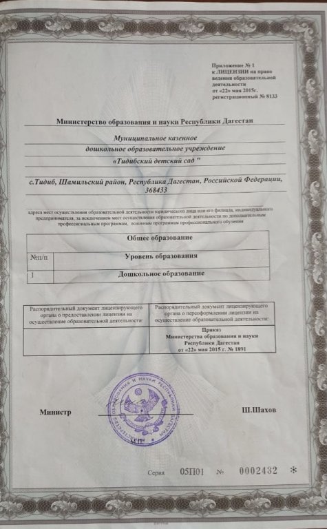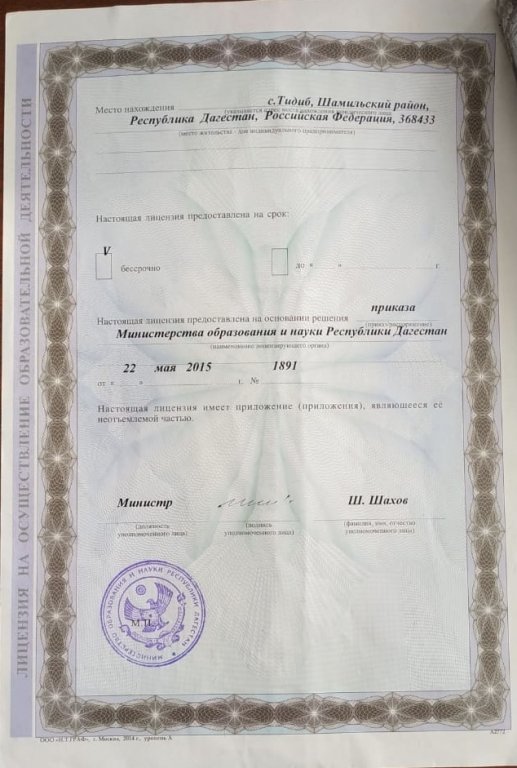 | Адрес местонахождения образовательной организации* | 368443, республика Дагестан, Шамильский район, село Тидиб, улица Ибрагима Ибрагимова, дом 36 |